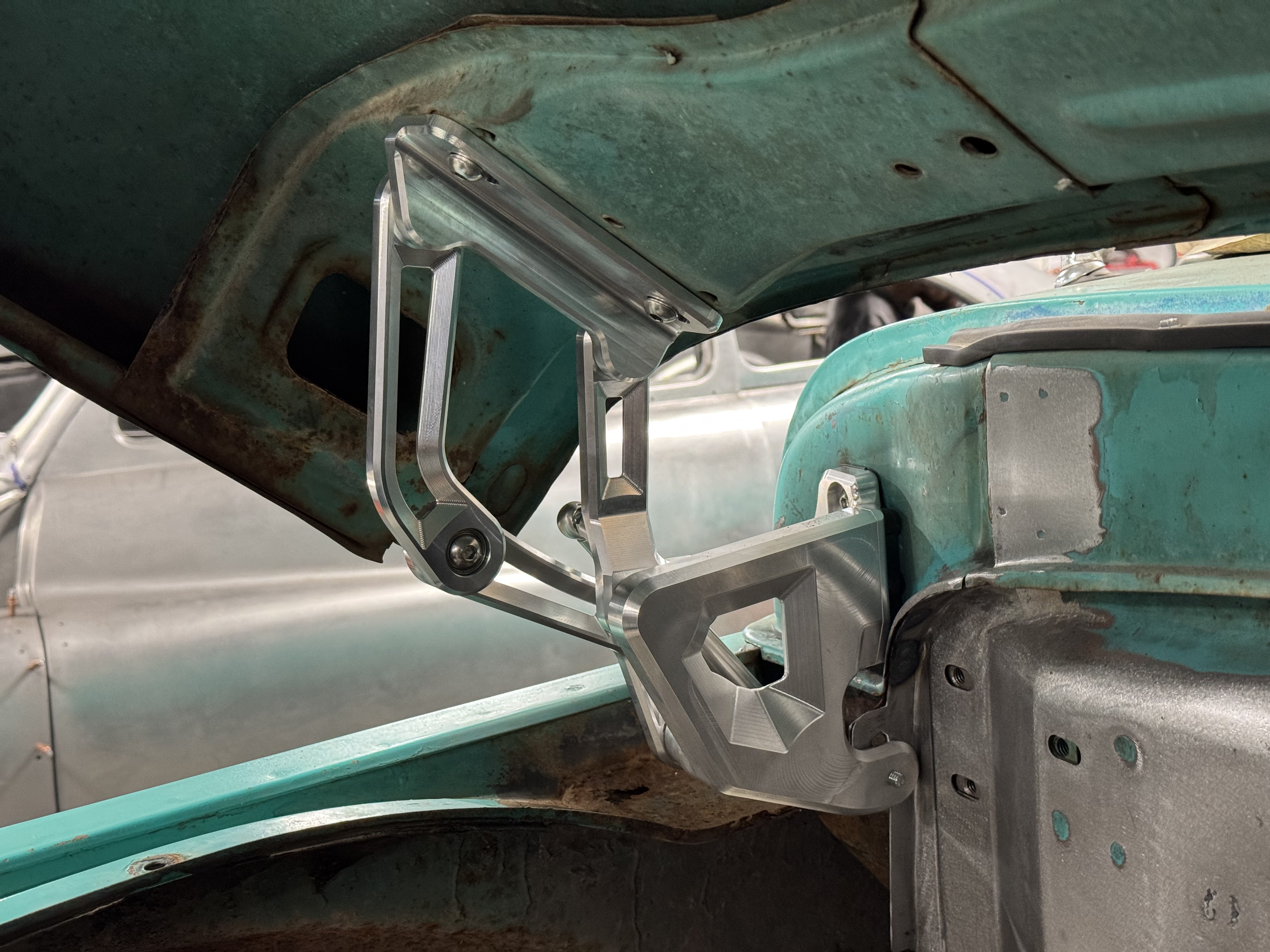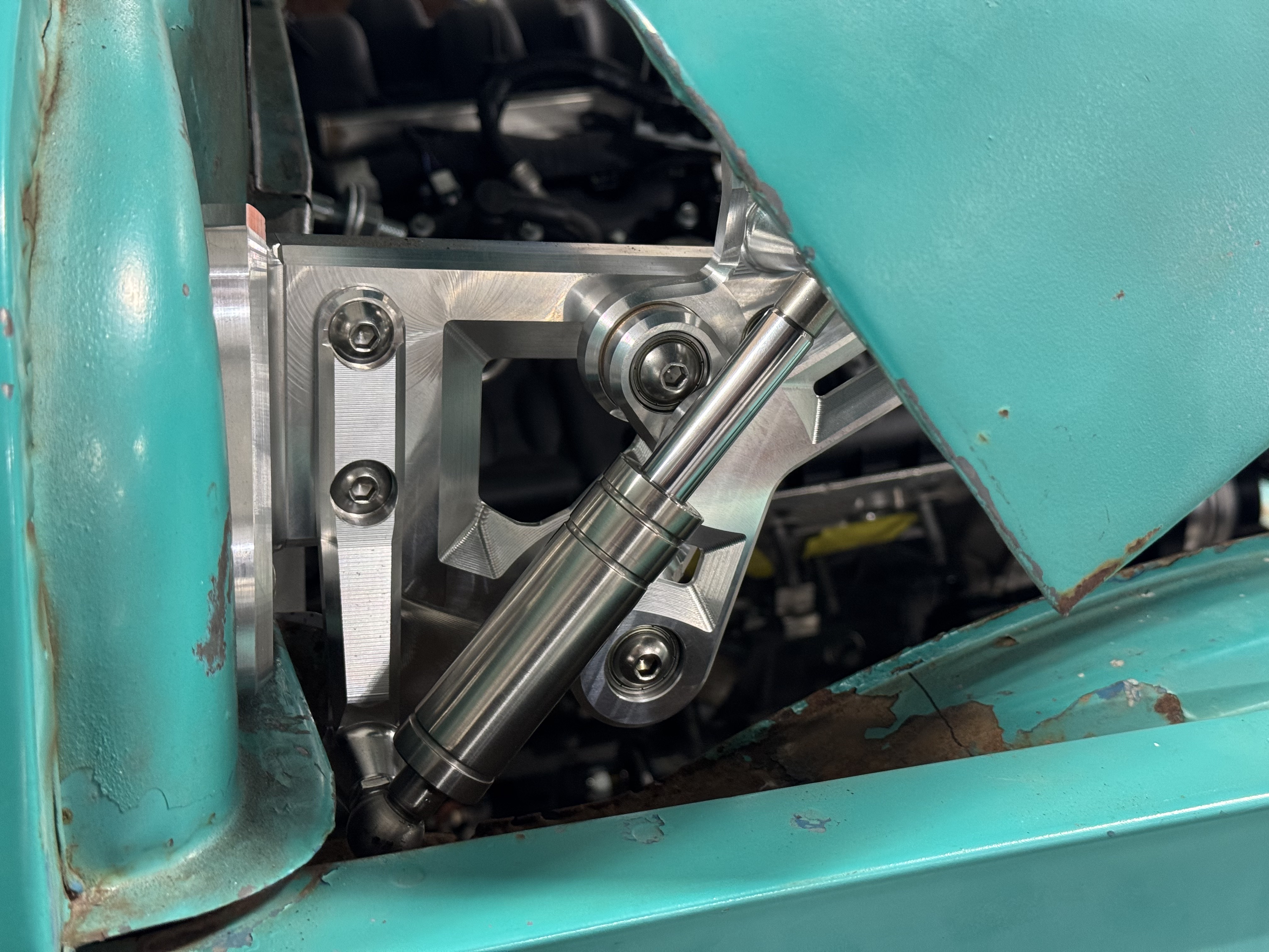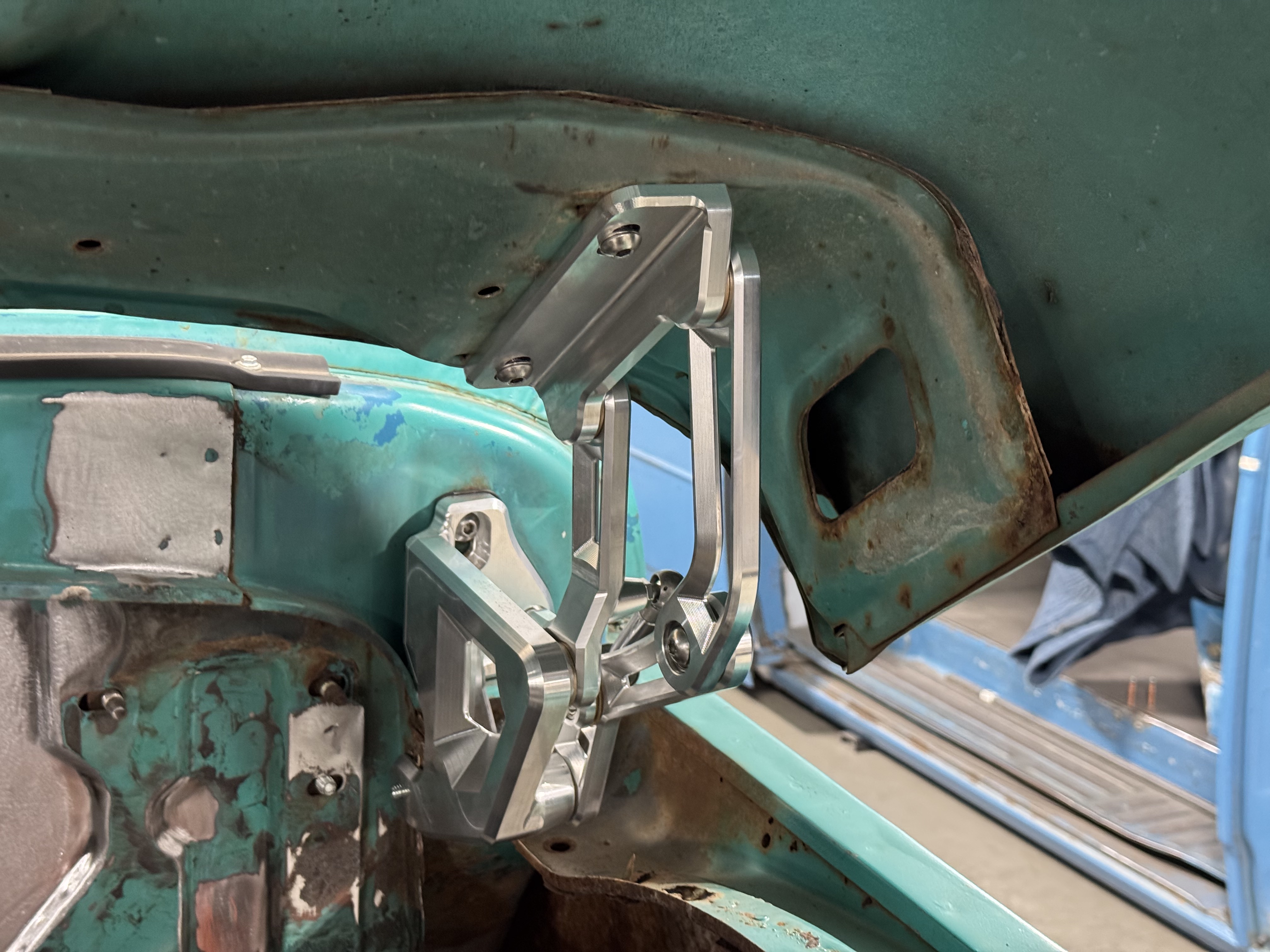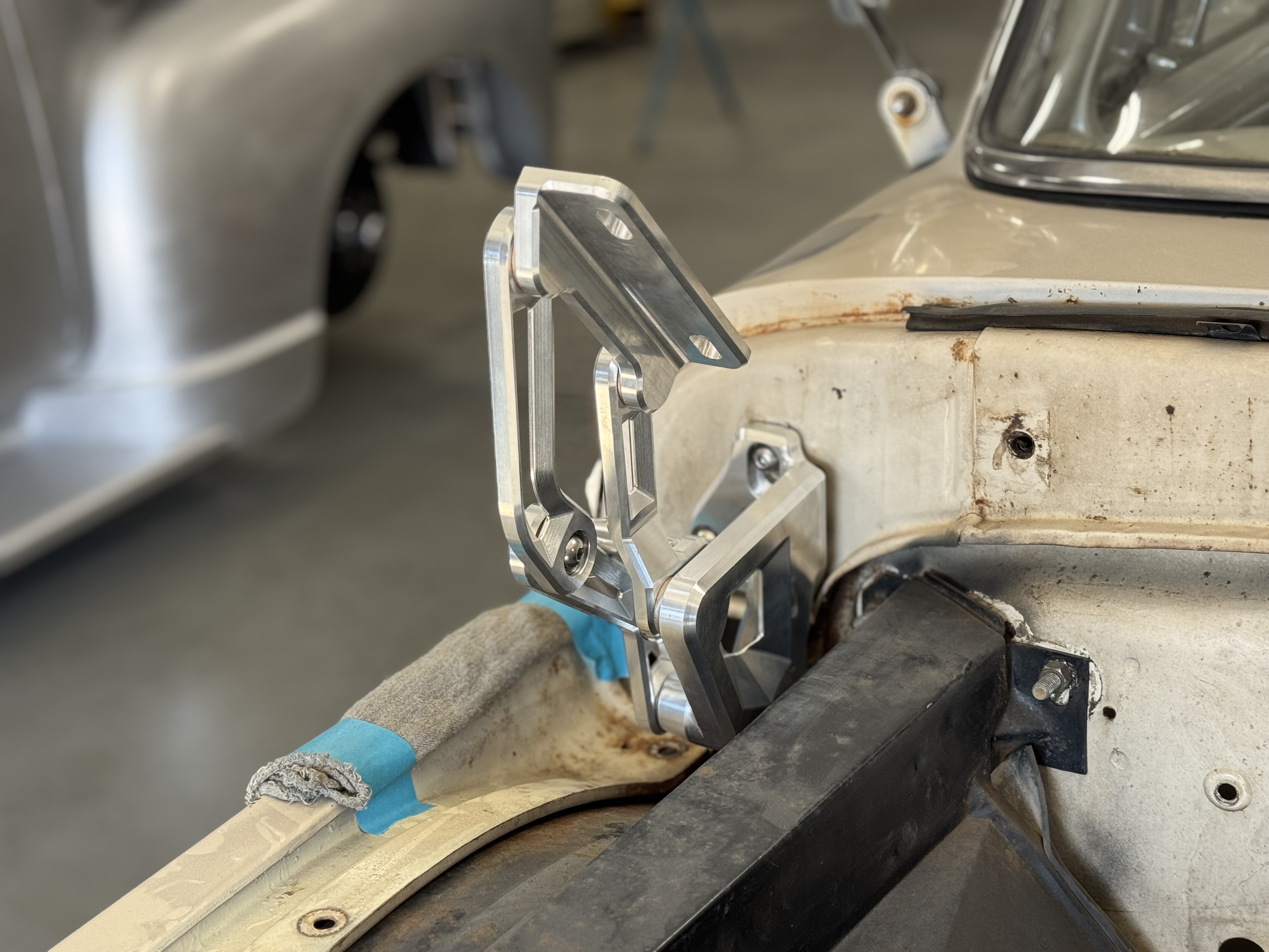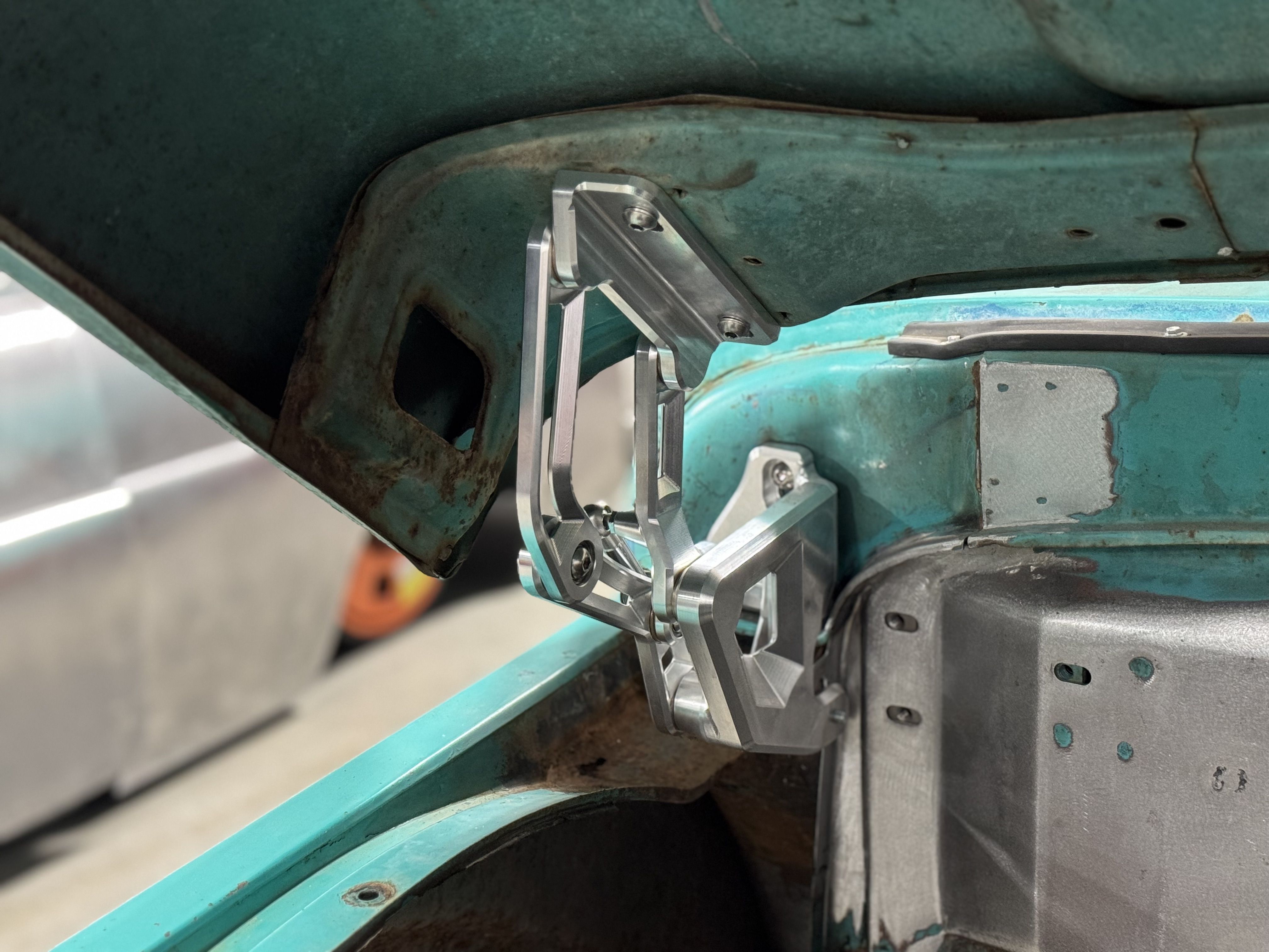 The firewall mount uses the stock inner fender mounting location. If you have any questions, please call the Tech Department at Scott’s Hotrods 865-951-2081