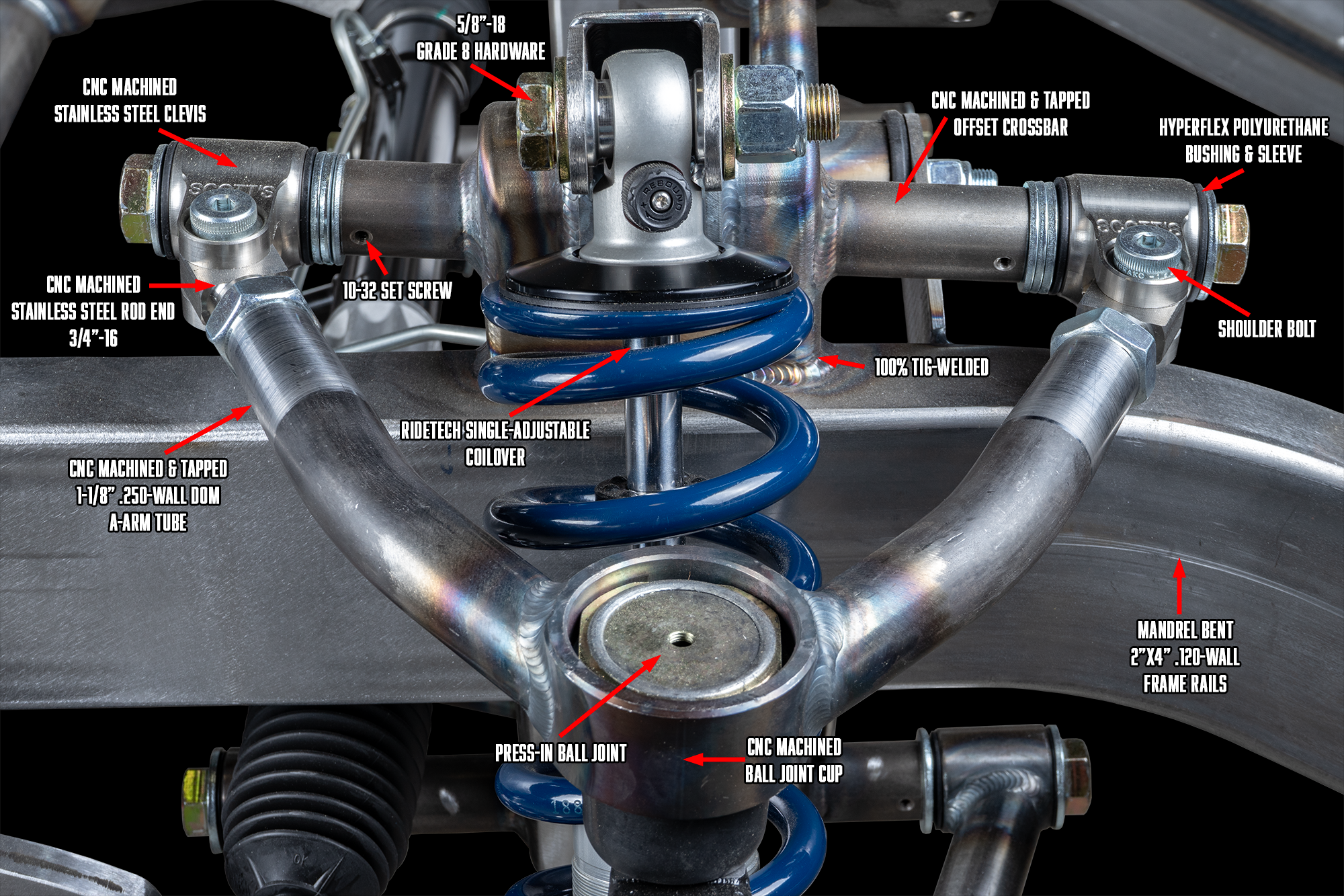 Scott’s Hotrods uses the same Ball Joint in all 4 positions on your IFS kit. These Ball Joints are PRESS FIT. Pay no attention to the threads. Our Ball Joint Cups are machined for a Press Fit. Be sure to remove your ball joints before you powdercoat your A-Arms.